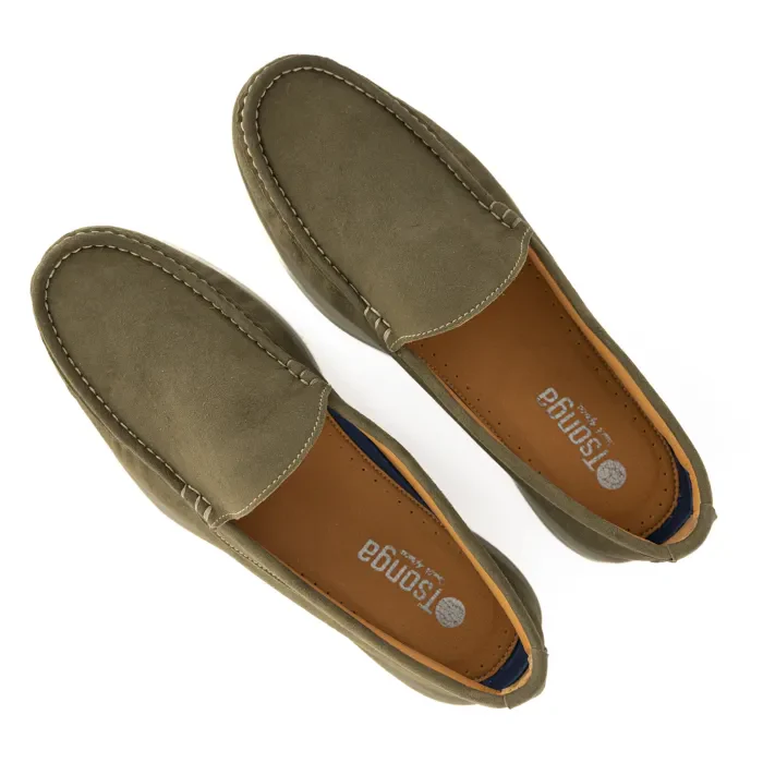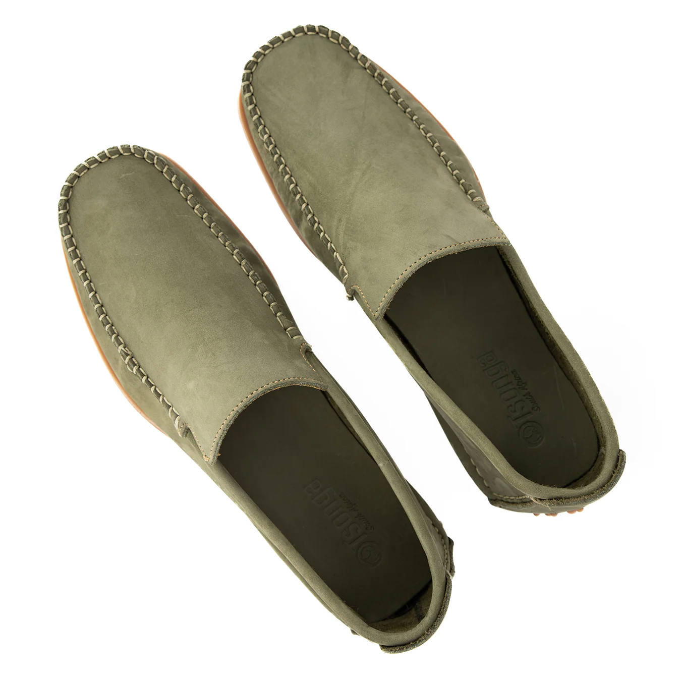 Insonga : Mens Leather Moccasin in Olive Nubuck